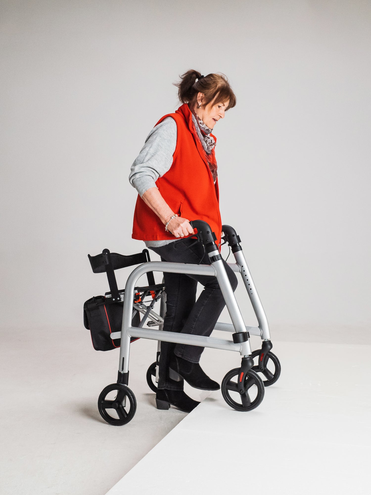 Im Gegensatz zu klassischen Rollatoren ist der ergoPrimo ein Posterior- oder Nachziehrollator, der hinter dem Benutzer geführt wird. Dadurch bietet er einen freien Vorwärtsbereich, was das Gehen natürlicher macht und Hindernisse wie Türen oder enge Gänge leichter überwindbar macht.